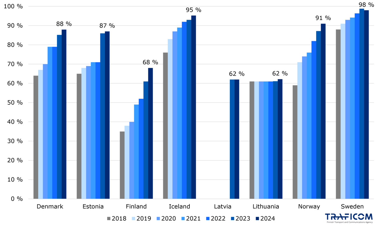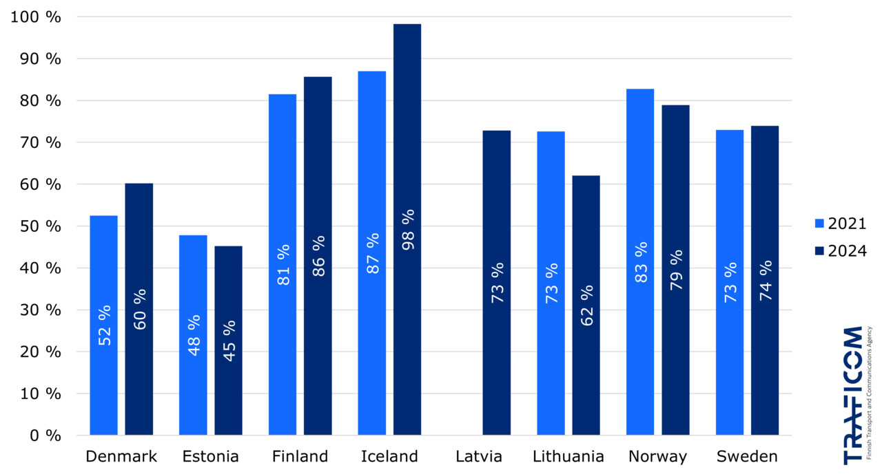 Based on the combined statistics of the Nordic and Baltic countries, it is also possible to calculate the adoption rate of fibre connections. This refers to the percentage of available fibre connections that have been taken into actual internet use. In 2021, 81 percent of the fibre connections available in Finland were in use, and by the end of 2024 the share had risen to 86 percent.