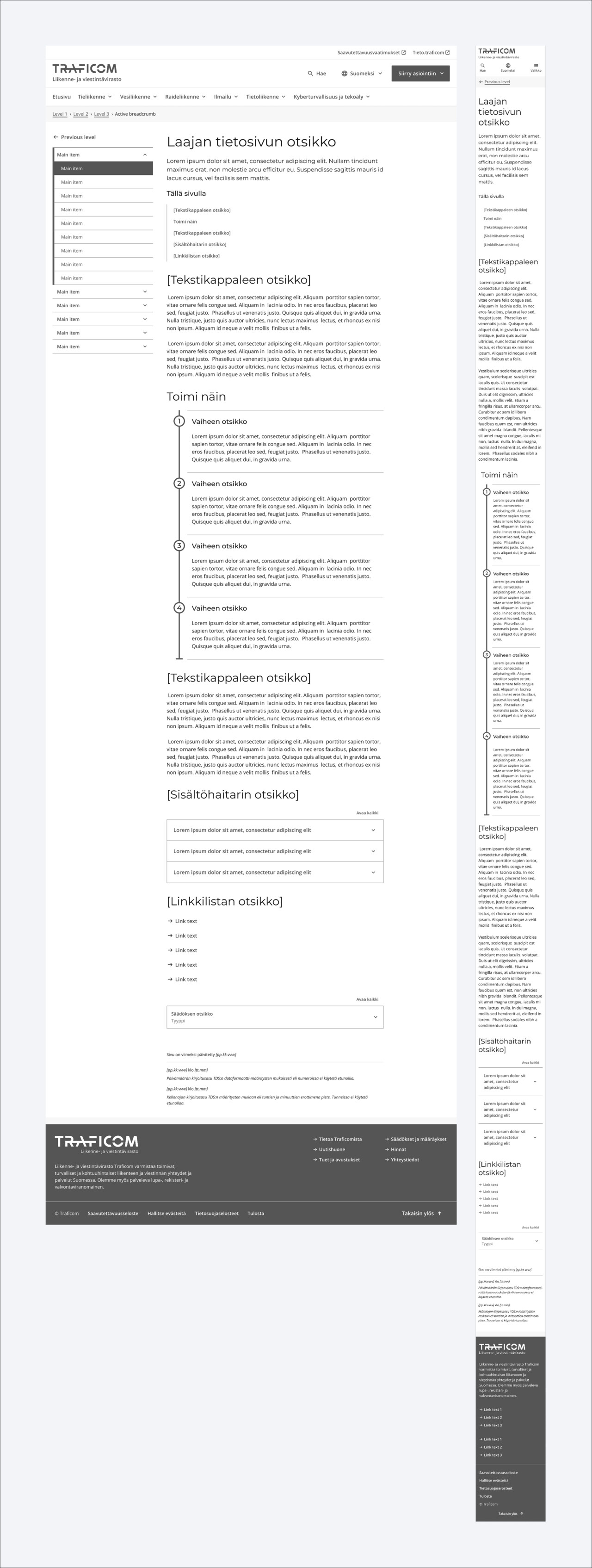 Laajalla tietosivulla esitellään pidempi asiakasprosessi. Laajaa tietosivua käytetään, kun asiakasprosessiin liittyy esimerkiksi useita Traficomin tai muiden viranomaisten palveluita tai useampia tietosivuja.