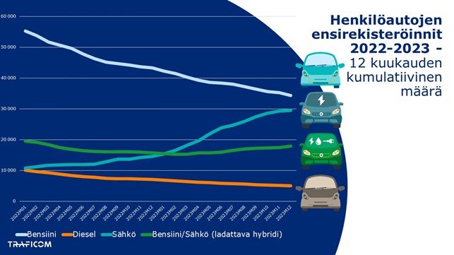 Henkilöautoja ensirekisteröitiin vuonna 2023 yhteensä 87 508, joista ladattavien osuus oli 54 %. Täyssähköautoja ensirekisteröitiin ennätykselliset 29 536 kappaletta - kasvua edellisvuoteen verrattuna oli peräti 103 %. "Kokonaisuudessaan ensirekisteröintien määrä on pitkän aikavälin keskiarvoa huomattavasti matalampi. Päästötavoitteiden kannalta on hienoa, että sähköautojen osuus kaikista henkilöautojen ensirekisteröinneistä oli jo yli kolmanneksen. Täyssähköautoja myös rekisteröitiin ensimmäistä kertaa ladattavia hybridejä enemmän", kertoo Traficomin johtava asiantuntija Juha-Pekka Konttinen.