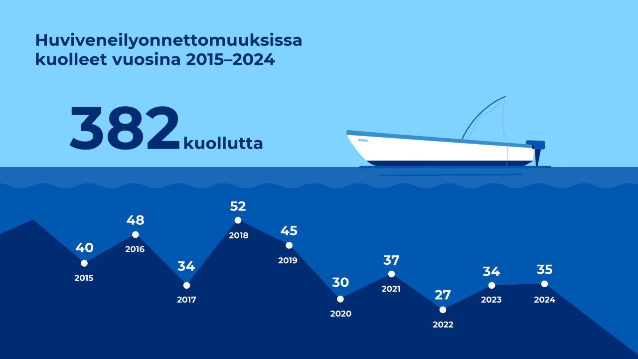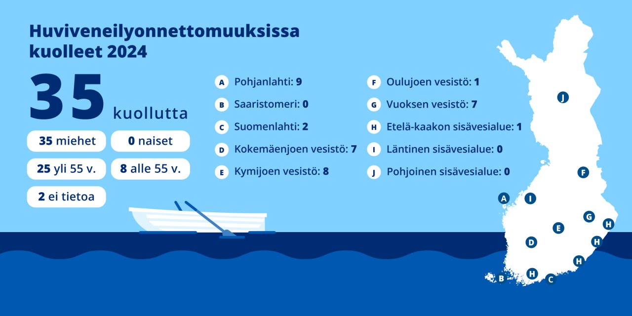 Vuonna 2024 Suomen vesialueilla menehtyi 35 ihmistä, mikä on yksi henki edeltävää vuotta enemmän. Kaikki veneilyonnettomuuksissa menehtyneistä olivat miehiä. Valtaosa menehtyneistä oli yli 55-vuotiaita ja heidän osuutensa kaikista kuolonuhreista oli yli 71 prosenttia. Kuolemaan johtaneita onnettomuuksia sattui erityisesti Kymijoen vesistöalueella sekä Pohjanlahdella, joissa menehtyneitä oli moninkertaisesti enemmän verrattuna muutaman vuoden takaiseen tilanteeseen.