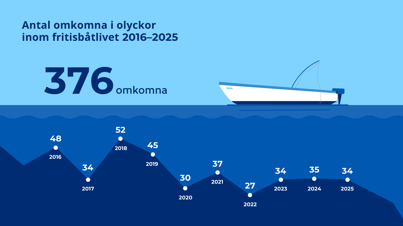 Olyckor med dödlig utgång inom fritidsbåtlivet har minskat under de senaste åren i Finland trots att båtlivet blivit alltmer populärt. Olyckor förekommer ändå fortfarande, särskilt på inre farvatten. År 2025 omkom 34 personer i fritidsbåtsolyckor, vilket är en person färre än året innan. Uppgifterna framgår av Transport- och kommunikationsverket Traficoms preliminära statistik för 2025.